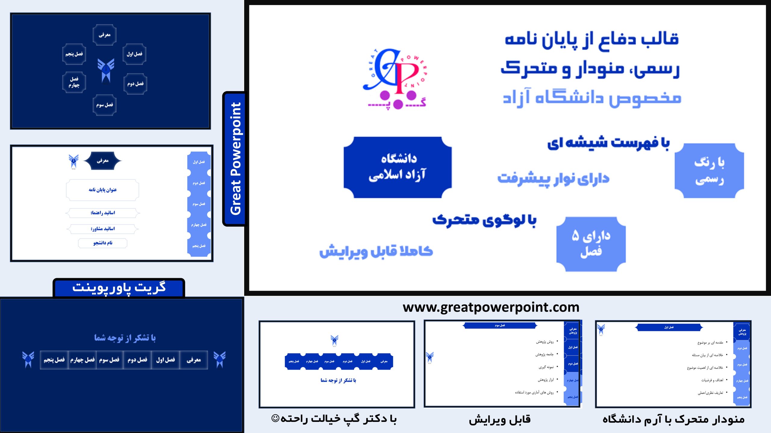 این قالب منودار مخصوص دفاع از پایان نامه است و 5 فصل دارد. لوگوی دانشگاه در این قالب متحرک است. در سمت راست هر اسلاید تغییر فصول را میبینید. منوهای این قالب هم رنگ لوگوی دانشگاه است. در هر فصل، شکل و جایگاه منو/عنوان فصل، تغییر می کند. بنابراین هنگامی که از فصلی به فصل دیگر می روید، هم نوار پیشرفت عمودی در سمت راست می بینید هم نوار پیشرفت در پایین اسلایدها. همچنین لوگوی دانشگاه آزاد در طول ارائه از بالا به پایین (در سمت چپ) حرکت می کند.